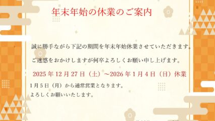今年の年末年始の営業日のお知らせします。12月29日(金)~1月3日(水)まで休日1月4日(木)から通常営業いたします。よろしくお願いいたします。